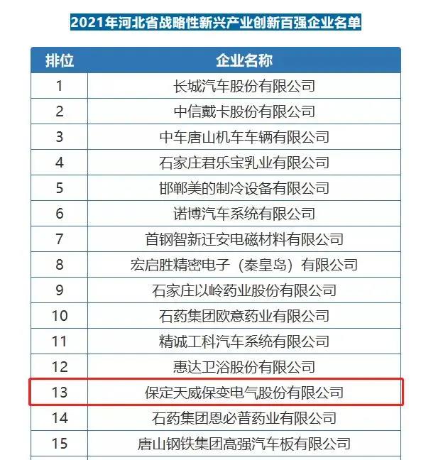 日前,河北省高新技术产业协会发布了2021年河北省战略性新兴产业创新百强企业榜单,保变电气上榜,位列榜单第十三名。