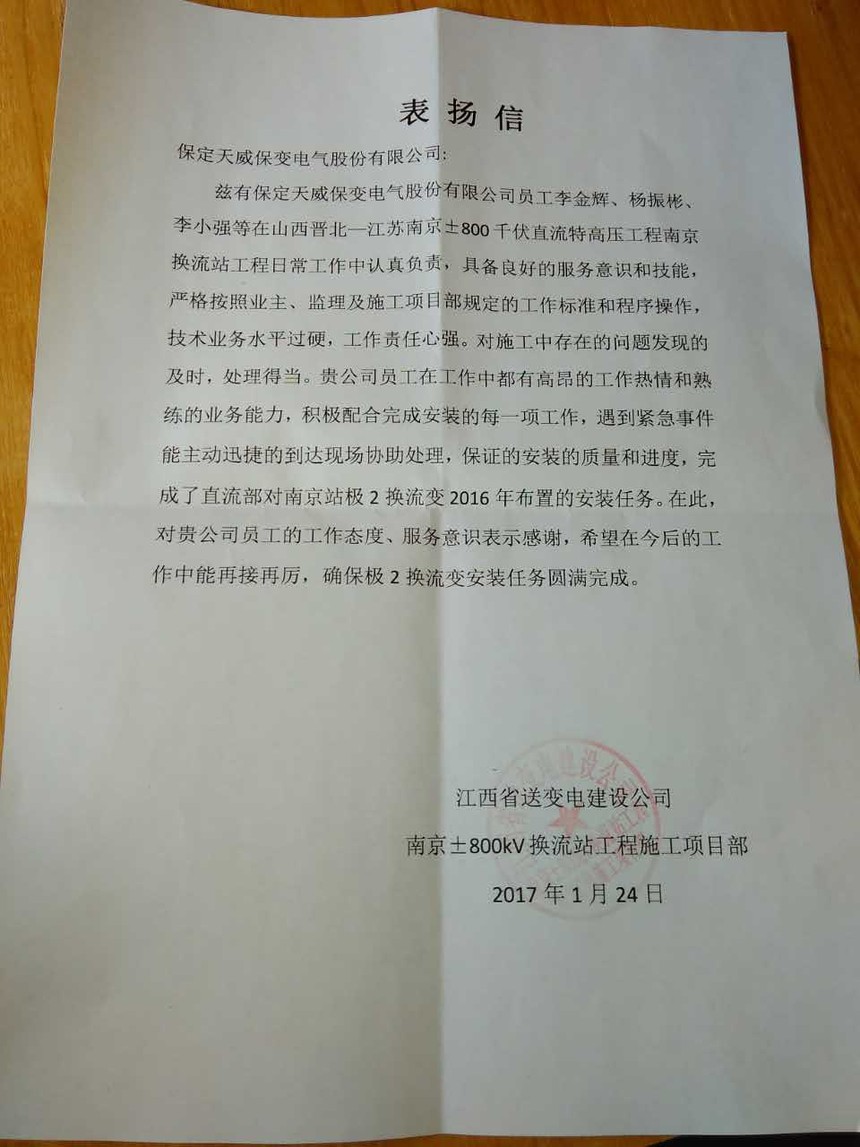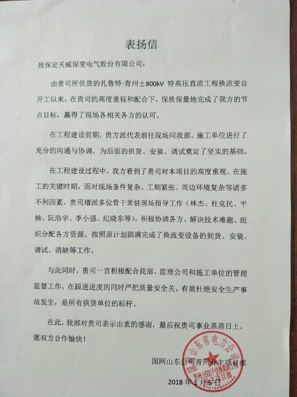 近期,保定天威保变电气股份有限公司先后收到了国家电网公司、中国核电工程有限公司、江西省送变电建设公司、越南永新一期epc联合体项目部向保变电气发来表扬信和感谢信,对保变电气优质的产品凯发彩票平台的售后服务表示感谢。