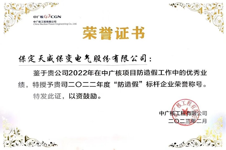 近日,保变电气喜获中广核工程有限公司2022年度防造假标杆企业凯发彩票平台的荣誉证书。此次证书的取得彰显了核电用户对保变电气在质保体系能力、诚信经营、防造假建设、符合性核查方面的高度认可。保变电气为2022年获此荣誉的8家企业之一,为电气板块获此荣誉的独家企业。