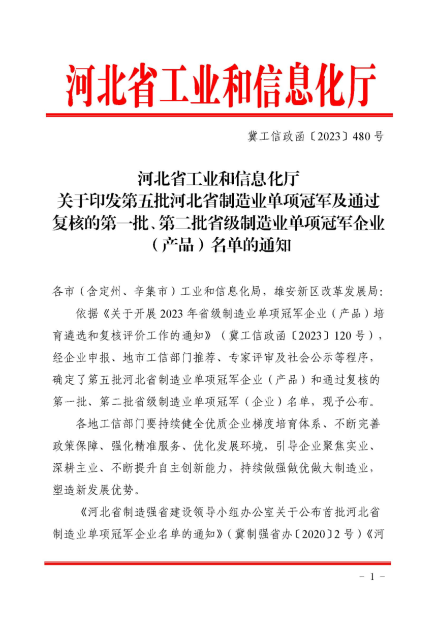 据悉,河北省制造业单项冠军企业(产品)评选由河北省工业和信息化厅主办,旨在推动河北省制造业高质量发展,推动河北省迈向全球产业链价值链中高端。省级制造业单项冠军代表河北省细分行业最高的发展水平、最强的市场实力,是制造企业的第一方阵、“河北制造”的排头兵。